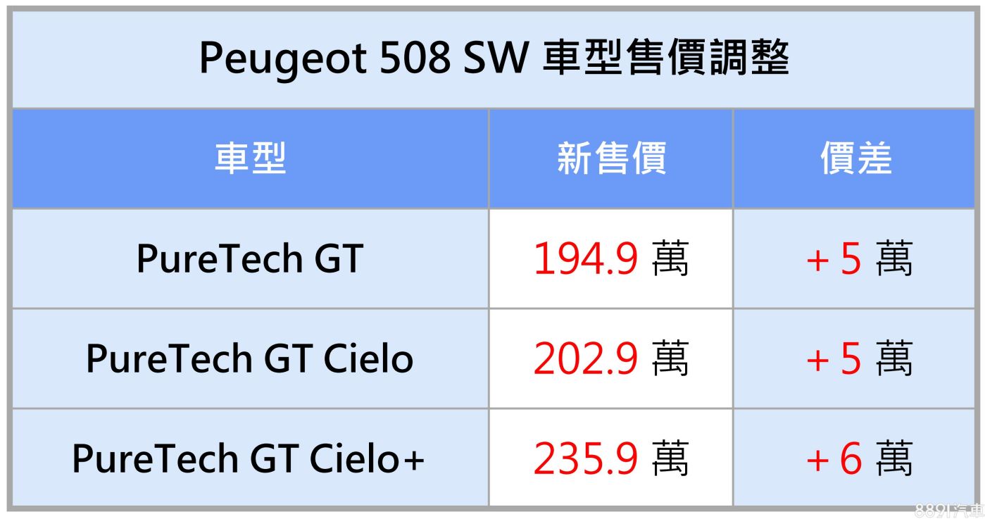 至於現售陣容中唯一的非SUV車型,508 SW同樣跟進調漲動作,其中GT和GT Cielo價格皆上漲5萬元,而頂規款GT Cielo+則漲價6萬,開價235.9萬方可入手。