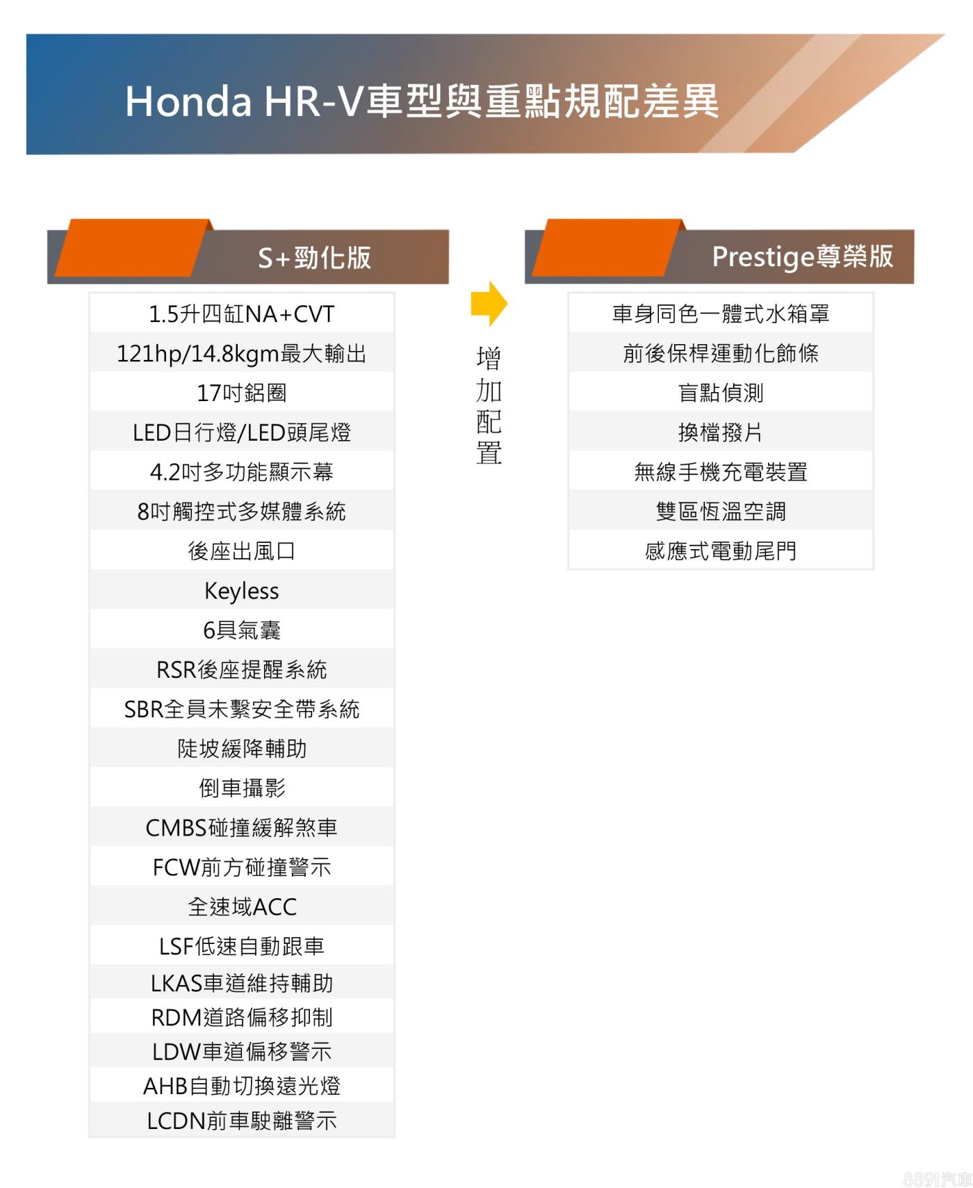 國產大改款HR-V採單一1.5升NA動力,並規劃S+勁化版、Prestige尊榮版兩車型,據台本透露「入門80萬起跳、頂規不超過90萬」,大致上入手價稍高於Fit e:HEV油電版(79.9萬),頂規則抓在與競品豐田Corolla Cross汽油尊爵(88.9萬)相近,不過正式售價仍留代發表時公布,目前暫定是6/14正式上市。