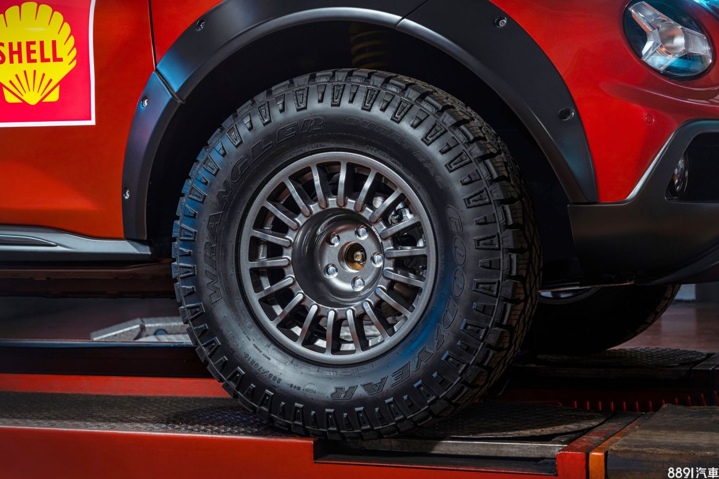 除此之外,全車懸吊系統皆配合競技需求而經過強化,並為四輪換上尺碼265/70R16的固特異Wrangler全地形粗花胎。原廠宣稱在此配置下,再艱難險峻的地形都能克服而過。