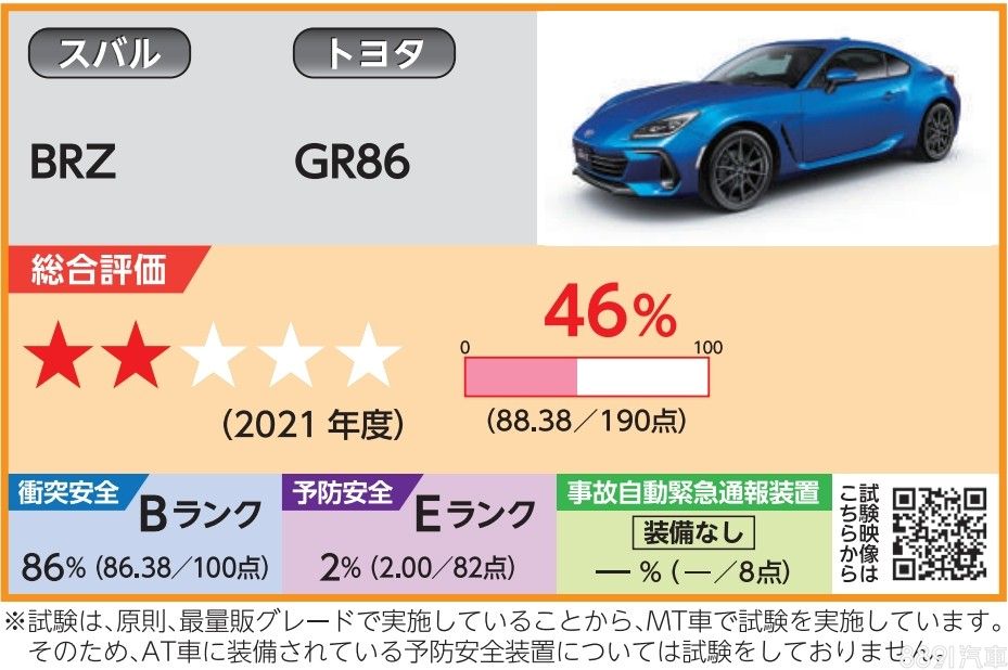 此外,大改款BRZ / GR86出乎意料僅獲得兩星評價,深入探究能發現在撞擊測試方面表現出色,最主要因為手排車型在「駕駛輔助」與「事故緊急通報」兩大項目表現不佳,導致成績敬陪末座。