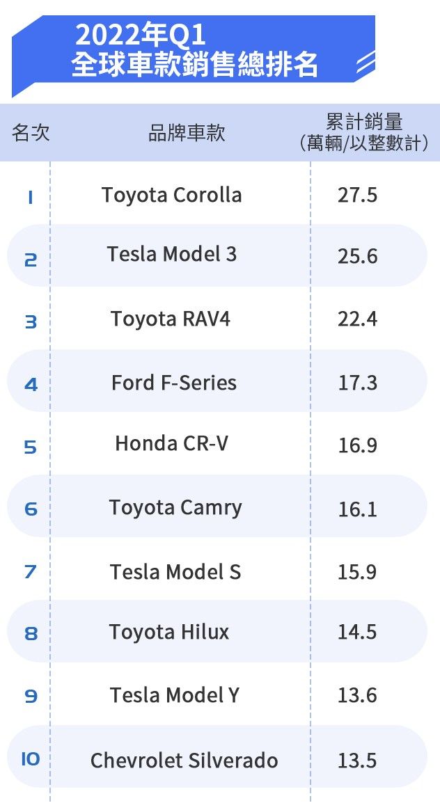 2022年第一季全球車款銷量前十名中,Toyota Corolla雖較去年同期有著12.9%之降幅,但仍以老將之姿穩坐冠軍,此外,豐田車是前十名中最多車款上榜的品牌,多達4款。