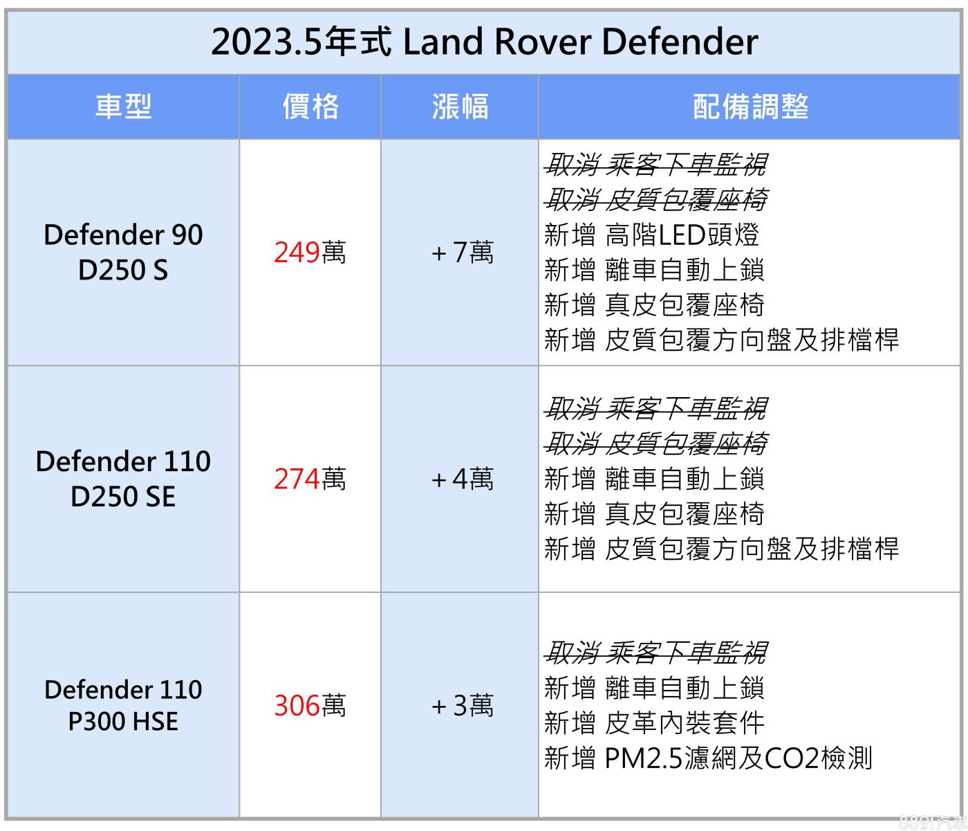 另一方面,Defender車系也同步上架了23.5年式車型,各車型皆維持原動力及原編成。其中,三門的Defender 90售價調整為249萬,漲幅7萬元。