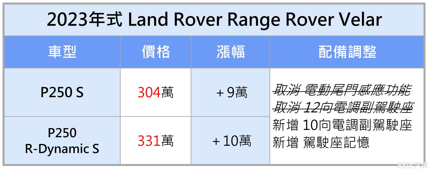 Land Rover部分車系推出新年式,標配項目和價格亦同步調整。其中,Range Rover Velar帶來2023年式車型,維持P250 S和P250 R-Dynamic S單一動力雙車型編成,依序開出304萬和331萬的新售價,漲幅分別為9萬、10萬元。