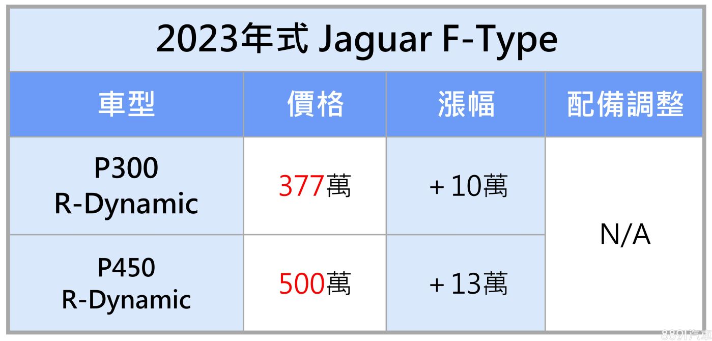 同步推出新年式的還有雙門獵豹F-Type,延續P300和P450兩種車型可選,配備規格亦維持不變,但價格上P300調整至377萬元,上漲10萬;頂規更有13萬漲幅,新售價為500萬元整。