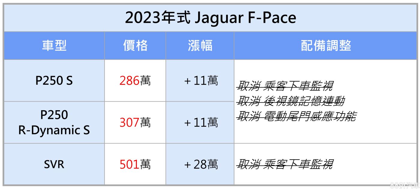 至於頂規的F-Pace SVR,則一舉調漲28萬元,開價501萬,漲幅為此波調整之最,配備上則同樣取消標配「乘客下車監視」警示功能。