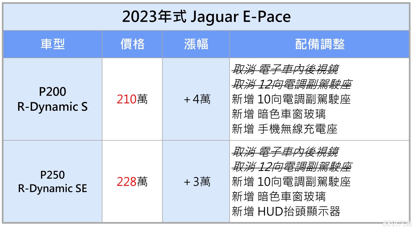 國內多款Jaguar車系開賣2023年式車型,其中漲幅最少的為E-Pace休旅車系,維持P200和P250兩種車型,新售價210萬和228萬,分別有著4萬及3萬漲幅。