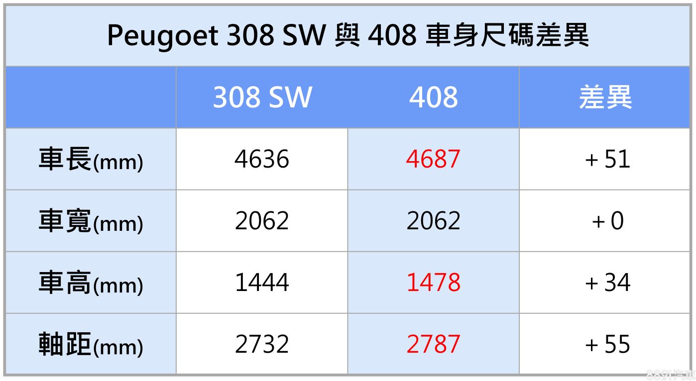 目前308車系供應有掀背款和「308 SW」旅行車型,不過新推出的408除了車寬外,其餘尺碼皆較308 SW更為放大,官方並宣稱408將藉此帶來更寬敞的乘坐空間。