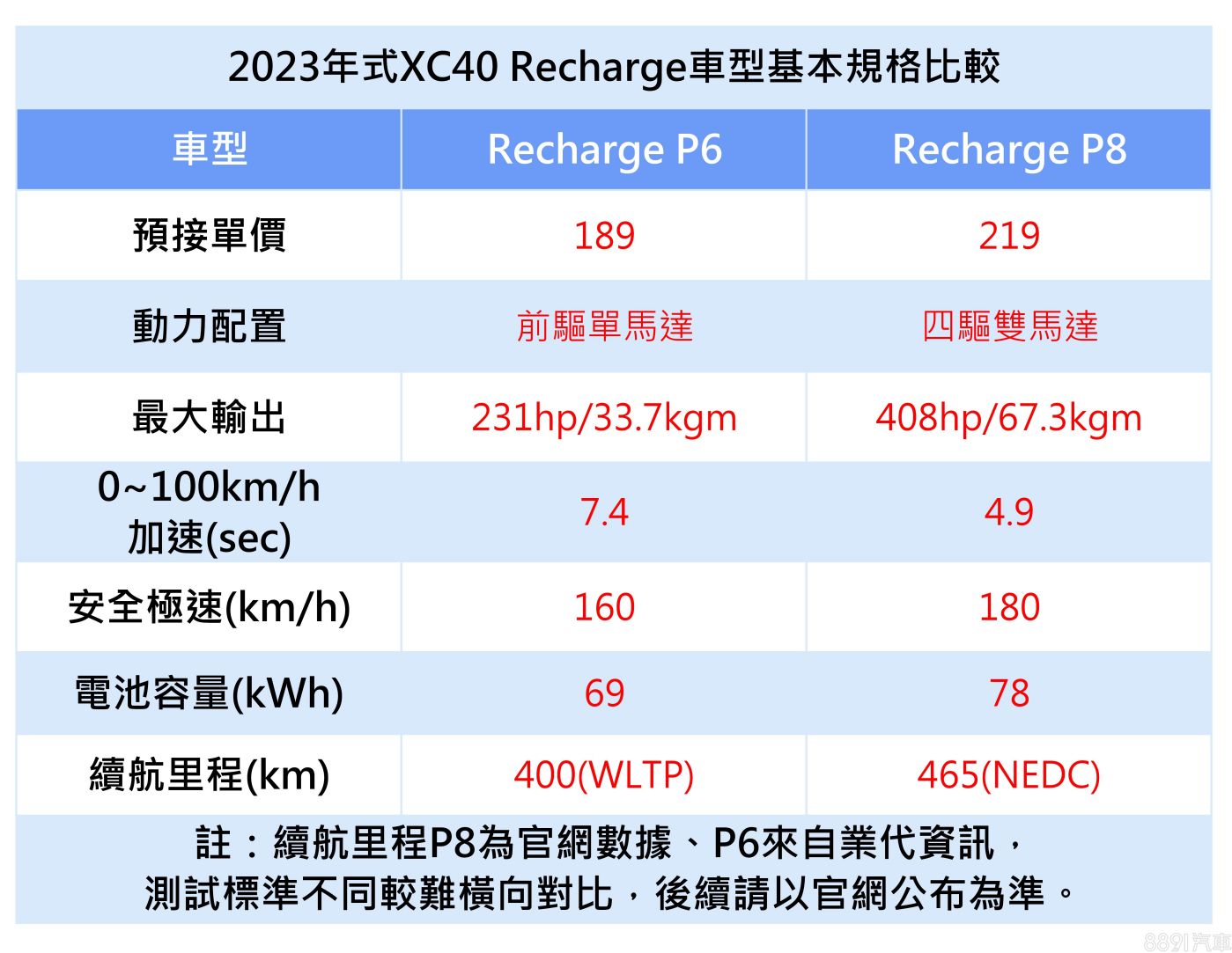 另外,純電版XC40 Recharge也會在2023年式調整編成,預計將新增單馬達配置的P6做為入門車型,據了解預接單價189萬,與現有雙馬達配置的P8(219萬)有著30萬的差距,正式售價及上市時間待國際富豪公布。