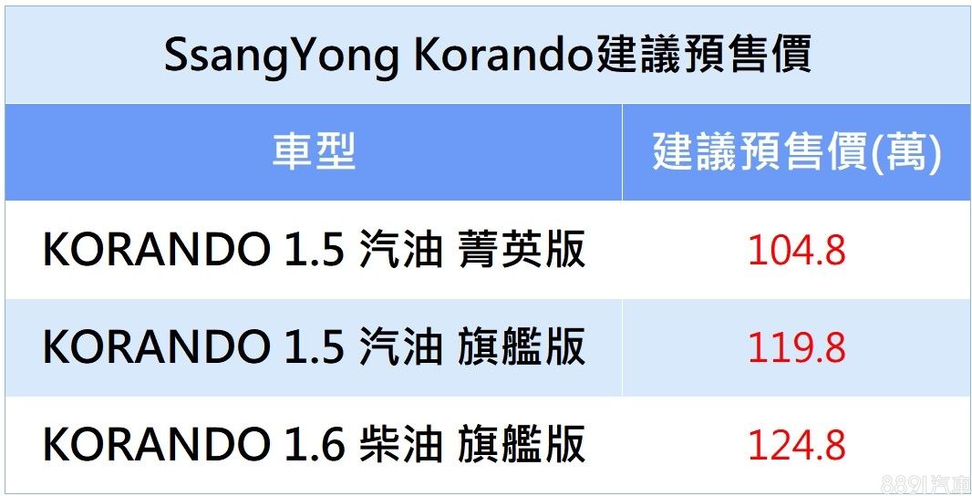 Korando導入汽油菁英版、汽油旗艦版、柴油旗艦版共三款規格,車色則提供氣質白、高貴紅、紳士灰及魅力黑共4種車色。