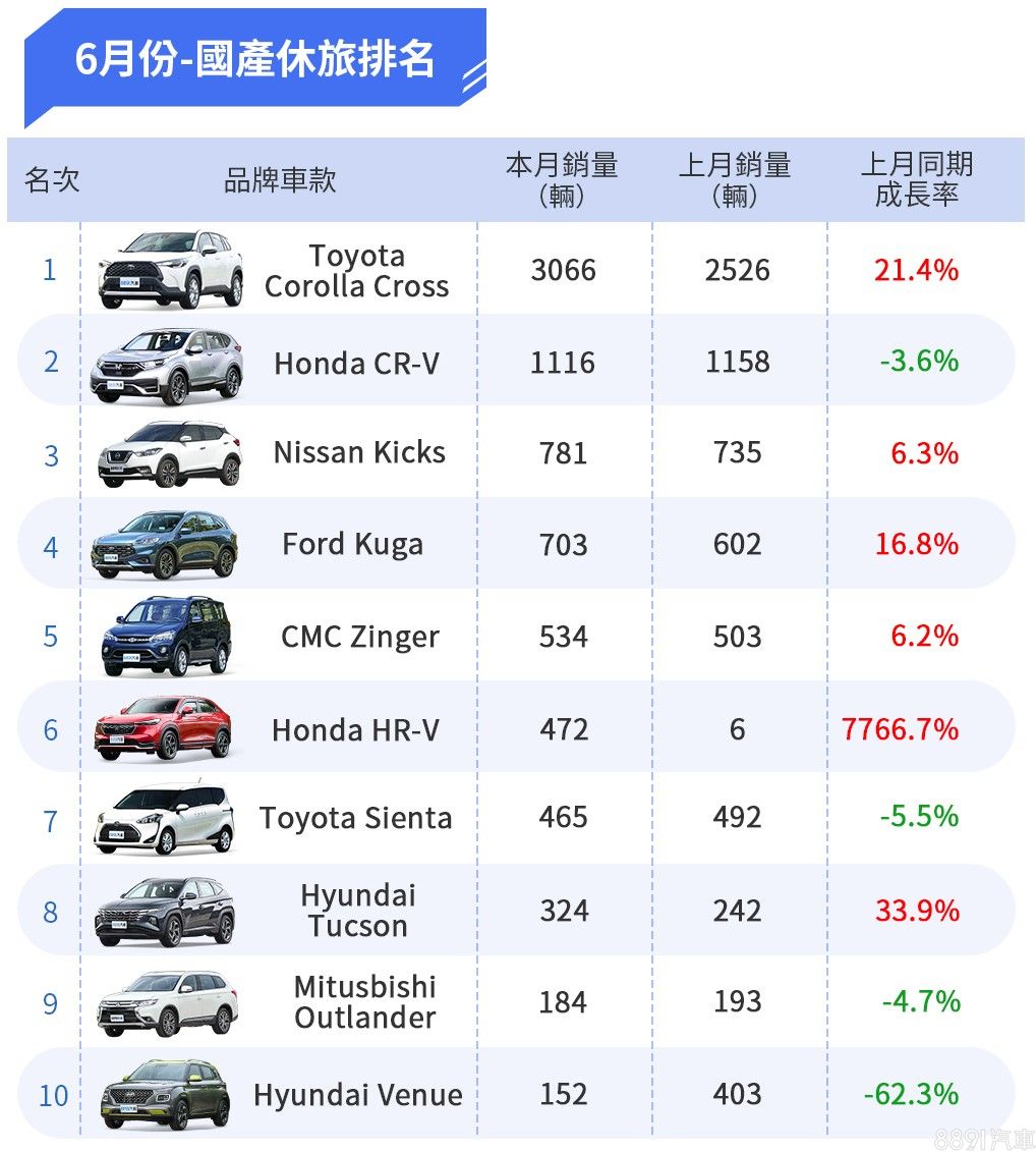 不過排行榜上也出現不少「驚喜」,包含Focus銷量難得贏過昔日神車Altis,大改款HR-V上市首月表現似乎沒預期好,至於許久未有新作品的Luxgen,也在6月底端出URX WildFun新車型,算是銜接品牌電動化前的過渡期產品。