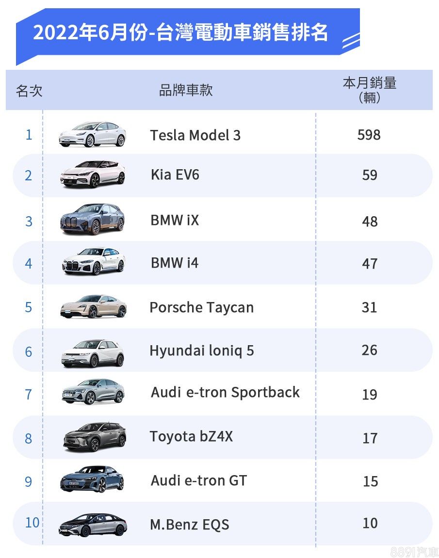 6月電動車市場同樣由特斯拉Model 3獨佔鰲頭,繳出598輛的單月成績,即便數量上較前月的1655輛下修不少,不過仍包辦6月電動車市場約64.5%的掛牌數。