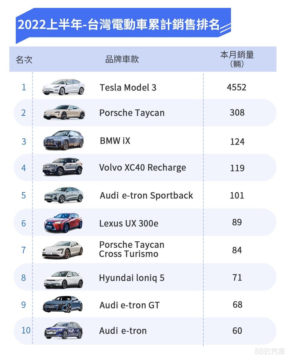 這5900輛新車中,光特斯拉Model 3單一車系,市場占比就超過77%,半年累積掛牌5607輛,亞軍及季軍則由保時捷Taycan和BMW iX所奪下,兩車系半年來分別有著308輛、124輛的領牌表現。