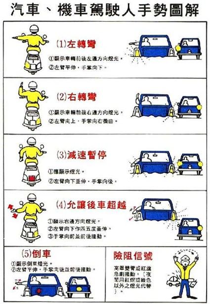 最後為大家放上一張考駕照筆試一定看過的駕駛人手勢宣導圖,不管是之前介紹過的燈號、喇叭還是今天的手勢,其實都屬於駕駛間用來溝通的一種輔助方式,若用路人善用這些溝通媒介,就能更完整掌握整體行車概況,從而達到降低交通意外風險發生率的目的,未來看到手勢時可千萬別誤會是挑釁囉!(圖/高雄市教育局)