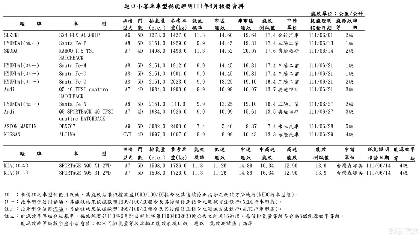 進口車方面,海外去年冬季發表的Skoda Karoq也現身名單,新車造型僅微幅修飾,主要針對安全輔助做強化,國內送測車型維持1.5升動力,以17.6km/L平均油耗取得2級認證,表現較小改前的16.0km/L有所進步。