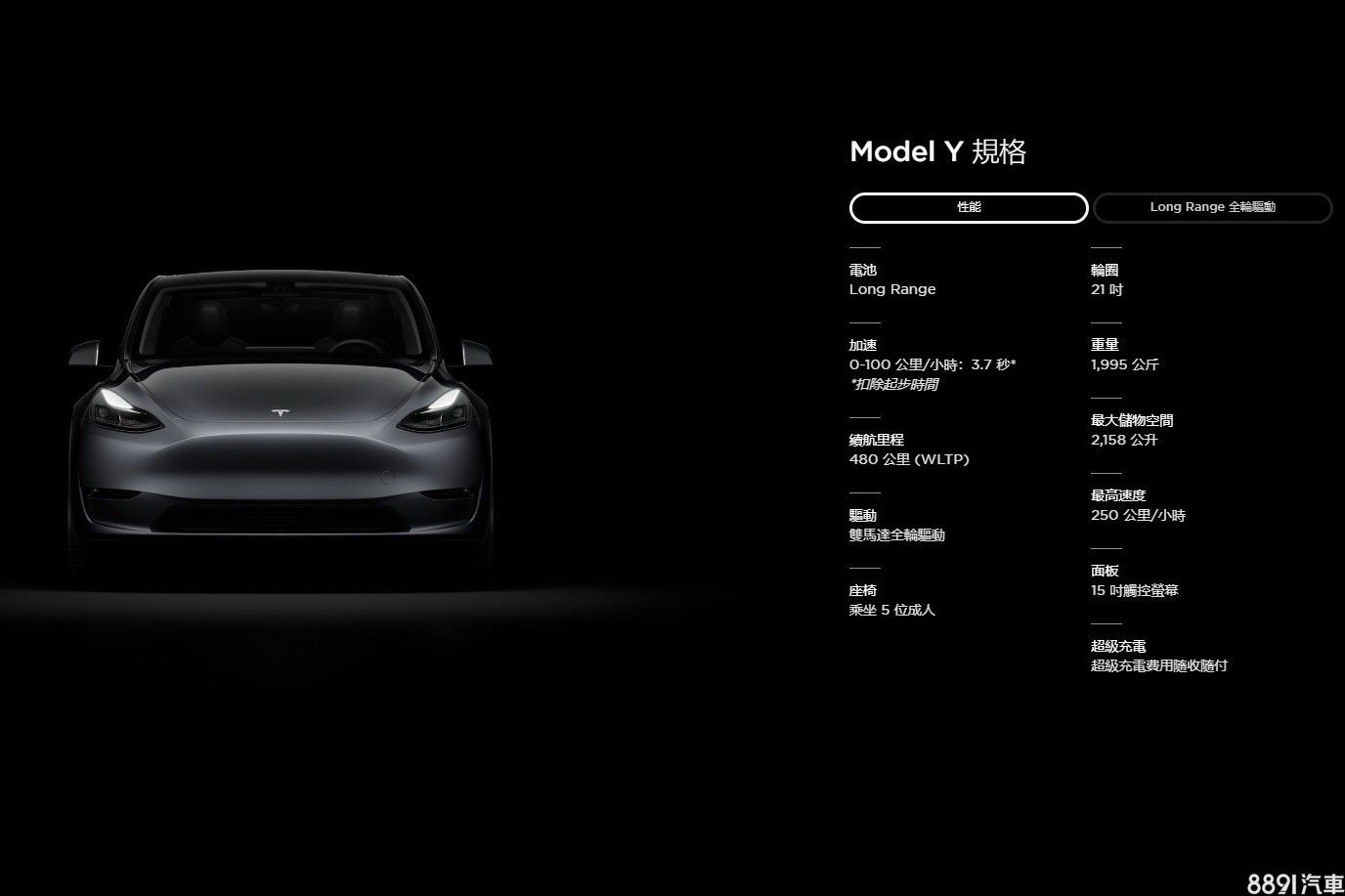 參考國內Tesla官網,Model Y預計將提供Long Range與性能版兩種規格,並未公布確切動力數據與電池容量配置,僅表示兩版本0~100km/h加速各為5秒與3.7秒,續航里程依序為505km(原廠預估值)與480km(WLTP)。