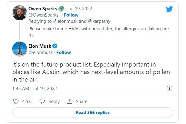 馬斯克的企圖心大家都知道,電動車、太空事業、能源供應以及神經科技已經很多方位發展,前陣子又在推特上證實要進軍家用空調市場,起因也就是因為美國加州大火持續蔓延時,有特斯拉車主在車上使用生化武器防禦模式,進而避免吸入四周的濃煙,證明這功能有其功效。(出處:X)