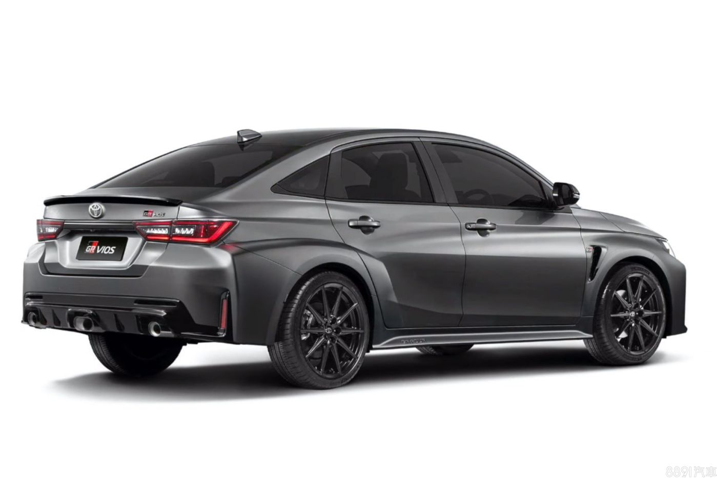 預想圖選擇略帶消光效果的灰色塗裝,搭配黑色鋁圈,為GR Vios增添點神祕感。車尾除了搭配小鴨尾尾翼外,Chin也將GR Corolla上獨特的三尾管設計,合成在GR Vios的設計當中。