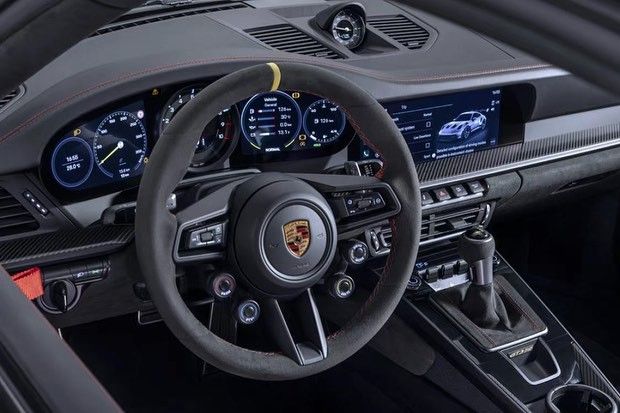 流出照僅曝光內裝一隅,並可見新911 GT3 RS搭載數位儀錶和擁有專屬介面的中控觸控螢幕。附帶黃色中心標的多功能方向盤,具備四個設定旋鈕,不過礙於流出照解析度,仍難辨識旋鈕具備那些調整功能。