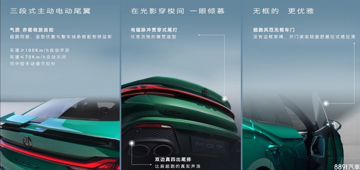原廠提到MG 7的亮點包含無窗框的車門、貫穿式的尾燈、雙邊四出排氣尾管、主動式電動尾翼,跑格的營造相當到位,光用看的就很熱血,其中又以主動式電動尾翼更是有牌面,當車速高於100km/h時便會自動開啟。