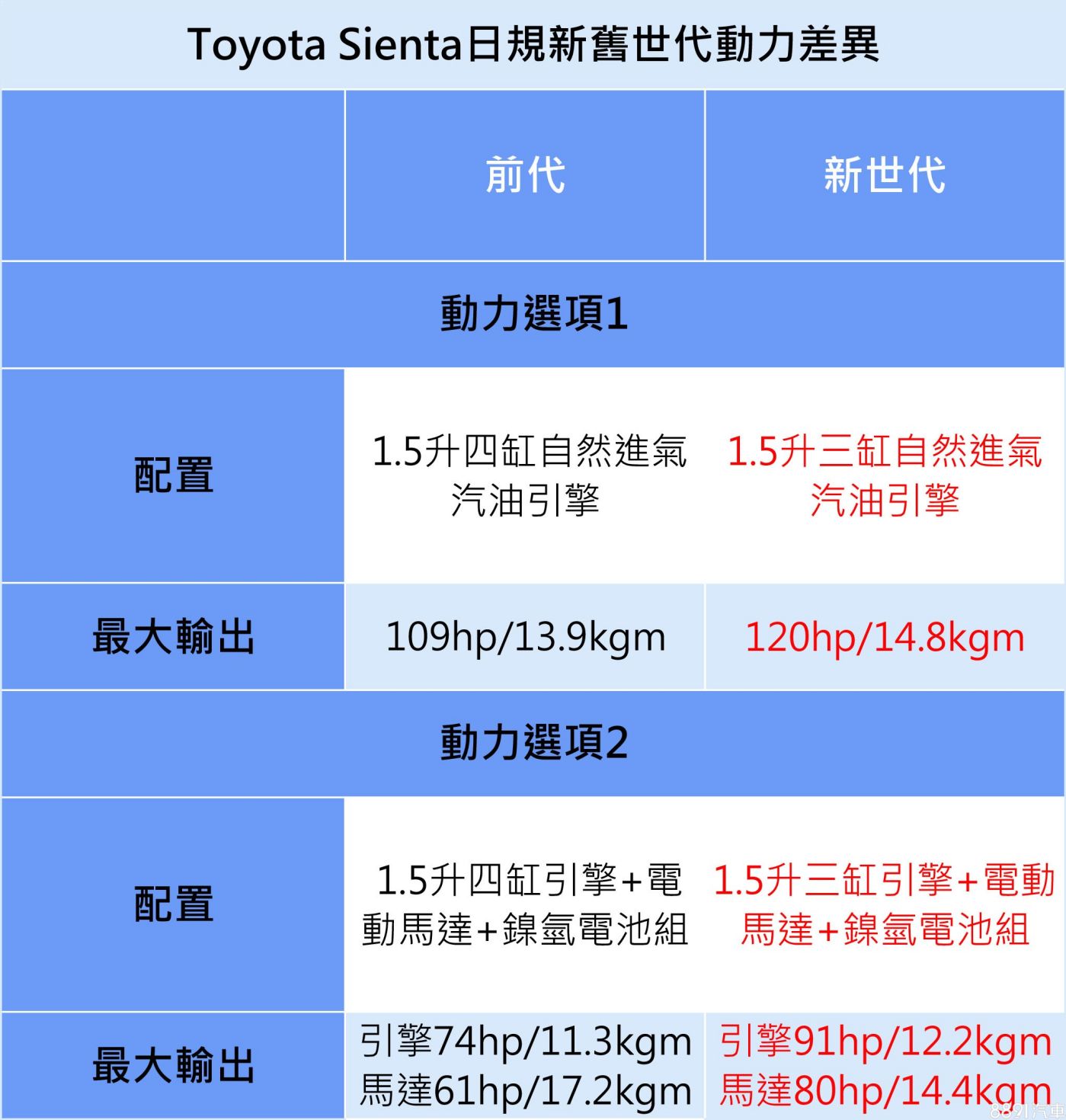 動力方面雖然日規仍提供1.5升汽油和油電選項,但完全不同於前代配置,簡單說,大改款Sienta改採用的是首見於新世代Yaris的1.5升三缸自然進氣汽油引擎,以及由1.5升三缸引擎、電動馬達、鎳氫電池組架構而成的Hybrid系統,油電版最佳平均油耗成績為28.8km/L,雖然和前代油電車型相同,但大改款新車油耗測試使用的是WLTC測試標準,比起先前的JC08模式,合理推估新車耗能表現肯定更佳。