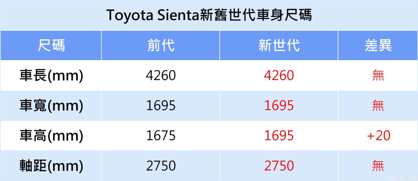 改以TNGA平台(GA-B)打造的新世代Sienta,僅車高獲得增長,其餘尺碼與前代相比均保持不變,車高增加主要反應在車室頭部空間,新車仍舊延續330mm的低門檻設計,利於輕鬆地上下車。