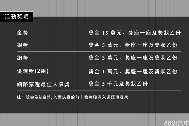 評分標準方面,創意設計佔40%,造型美學和使用者需求則各佔30%。明年1/13初選徵件時間截止後,主辦方將選出10組設計入圍決賽於2月中旬公布,並提供入圍者5萬元補助費製作1:8比例模型參與決賽評比。