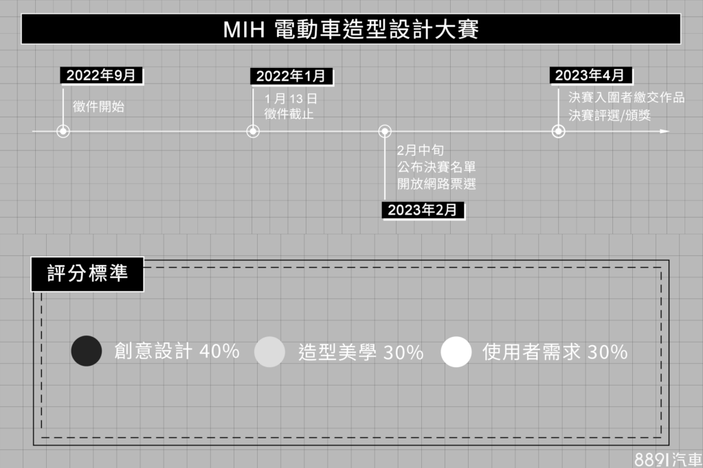 由鴻海所主導的「MIH開放電動車聯盟」,宣布舉辦電動車造型設計大賽,並自本月起至明年1/13止開放徵件,經過初賽和決賽評選後,獲選的前三名作品,將可獲3~15萬元不等的獎金!
