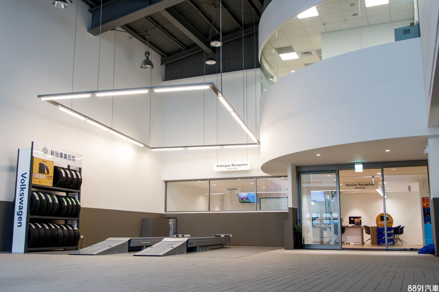 福斯新店展示中心採用挑高的空間規劃,落地帷幕玻璃帶出明亮視野,提供五大車輛展示區,可依照消費者用車需求體驗適合車款,重點產品展示區則有專屬可變色調天幕,以及LED螢幕播放最新產品資訊,搭配數位化的產品規格立牌,方便消費者詳細完整的閱讀規格配備、車輛相關影片以及最新銷售方案,亦有愜意舒適的休憩空間。