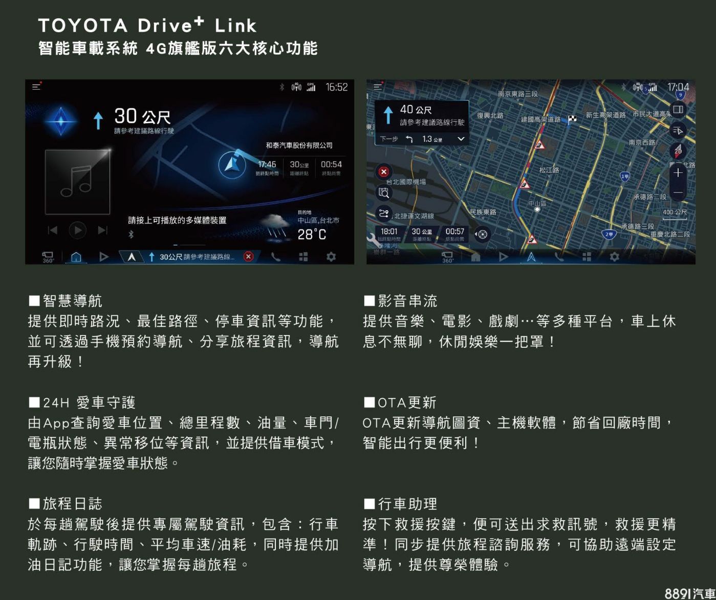 車機維持搭載9吋觸控螢幕,但內建系統自Drive+ Connect升級成Drive+ Link智能車載系統,提供包含智慧導航、影音串流、OTA更新、24H愛車守護、旅遊日誌、行車助理的六大功能。