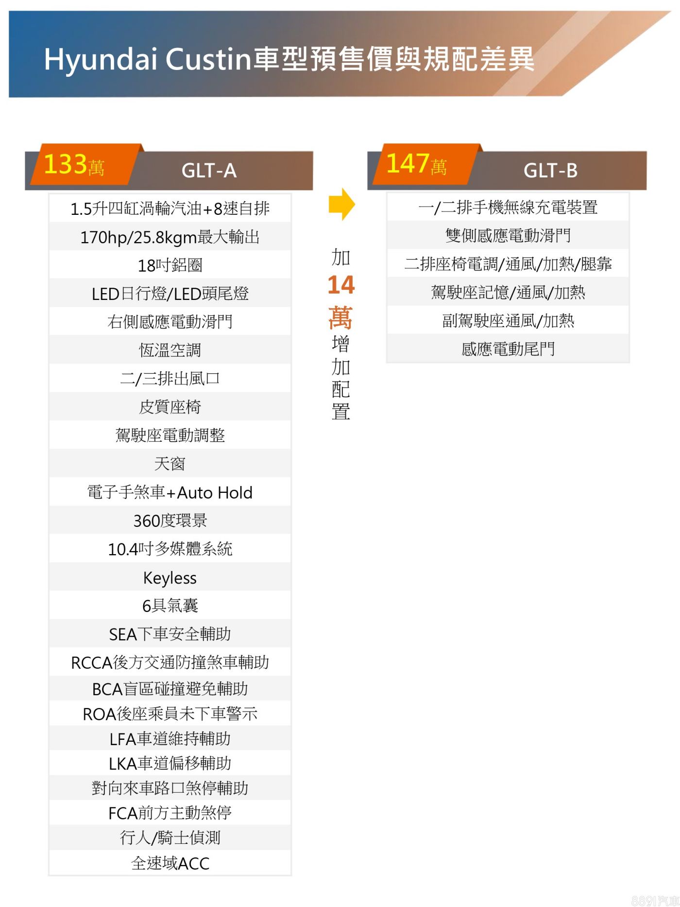 Hyundai Custin尺碼與Kia Carnival相近,是中大型MPV產品,不過由於其國產化身分,讓它目前在國內可說無直接對手,據預售資訊,提供GLT-A、GLT-B兩車型,預售價分別為133、147萬元,重點規配如附表。