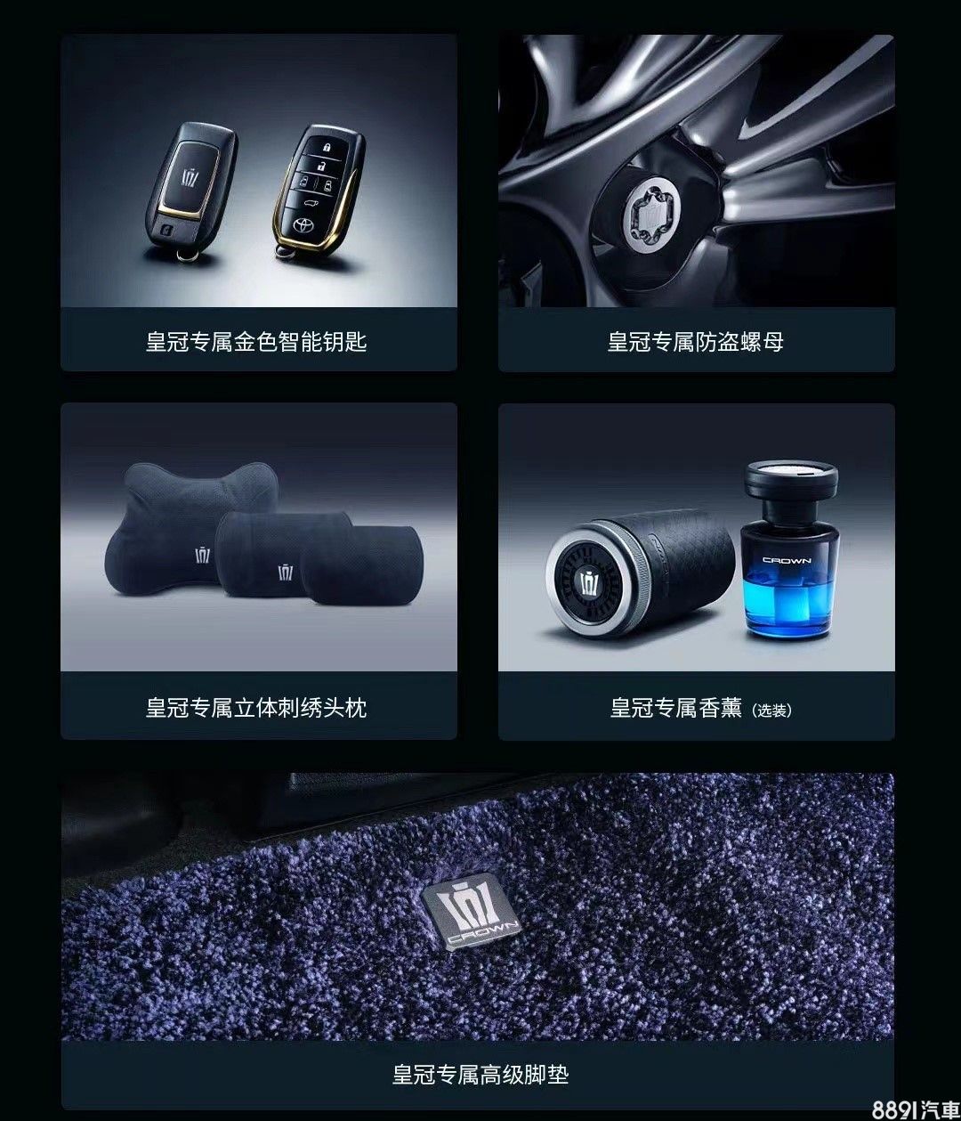 配件部分也有不少獨家好料,包含皇冠專屬金色車鑰匙、防盜螺母、立體刺繡頭枕、高級腳踏墊、車艙香氛套件。