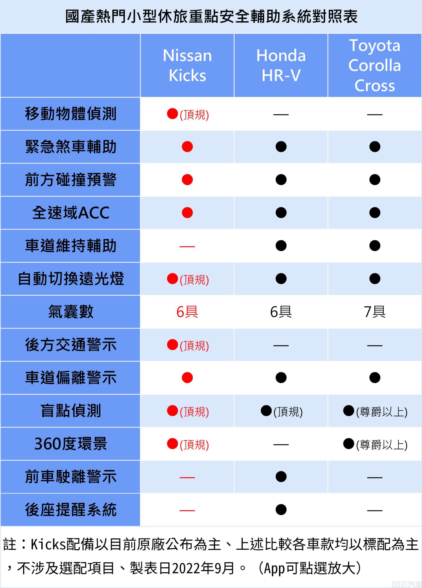 小改款Kicks補上舊款缺乏的ACC,不過相比對手都符合Level 2自動駕駛等級來說,確實是較弱的一環,至於其他安全輔助項目,雖不到應有盡有,但也堪稱完備,沒什麼好嫌的。