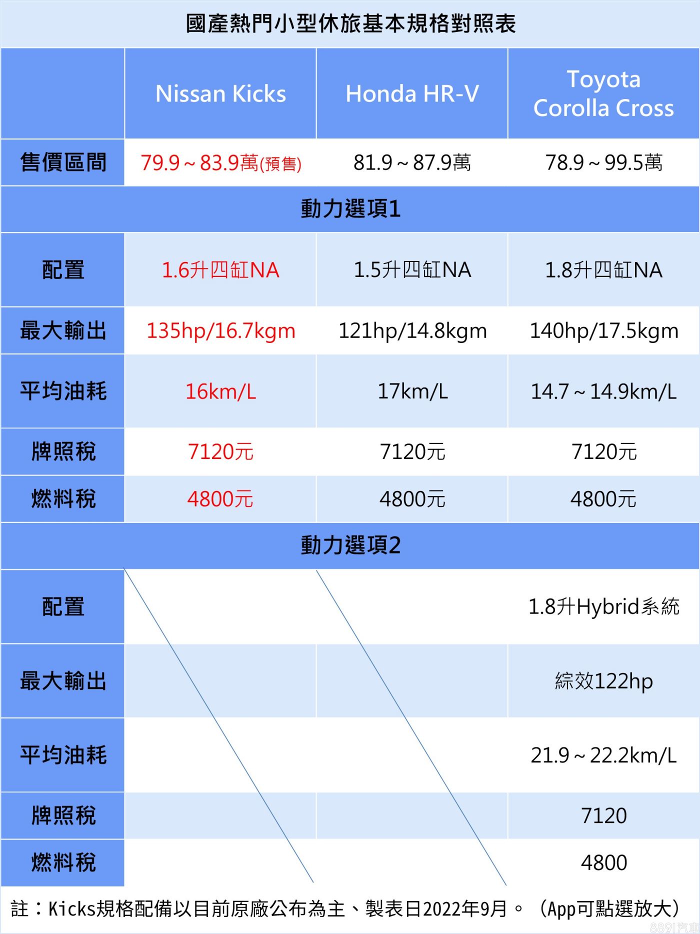 若對上HR-V和Corolla Cross的汽油版本,其實都在出力與油耗上各有勝負,加上三車在稅金級距上旗鼓相當,其實並沒有誰具備壓倒性的優勢,唯一能說嘴的,就是Corolla Cross還有油電選項,在油價高漲的時期,對於用車極頻繁的消費者來說,油電帶來的經濟效益,Kicks和HR-V確實較難與之匹敵。