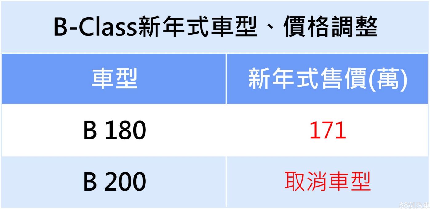 B-Class車系則取消先前頂規的B 200,僅有單一動力版本:B 180,售價為171萬元,同樣維持先前定價。