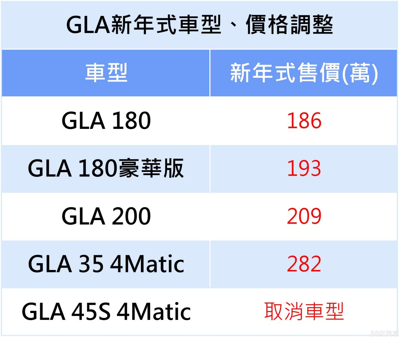 GLA車系將「性能一哥」GLA 45S 4Matic自車系中移除,改採GLA 180、GLA 180豪華版、GLA 200和GLA 35 4Matic四車型編成,正式售價亦無變化,分別為186、193、209及282萬元。