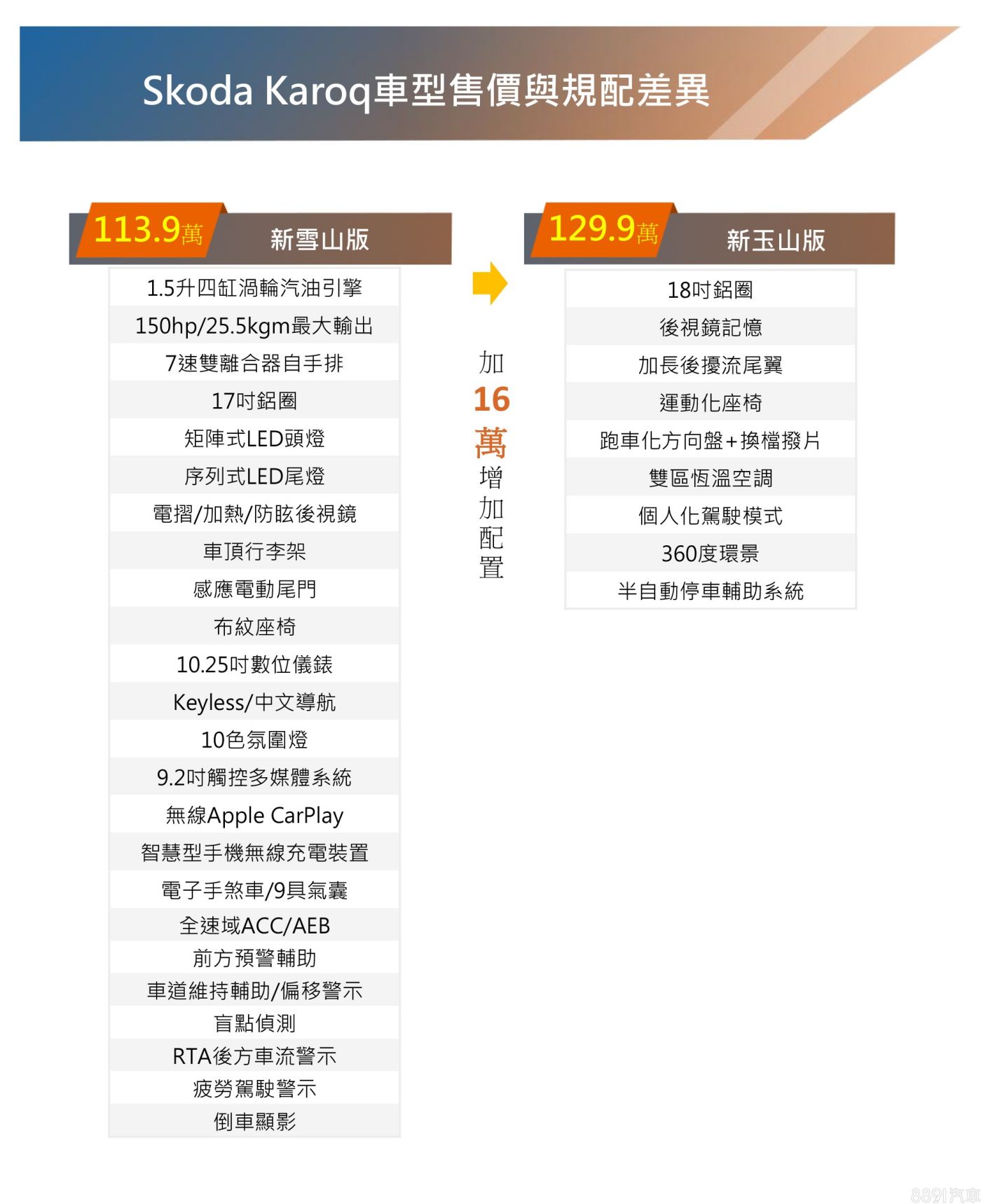 小改款Karoq在台提供2車型:新雪山版和新玉山版,分別開出113.9、129.9萬元之售價,重點規配差異如附表。