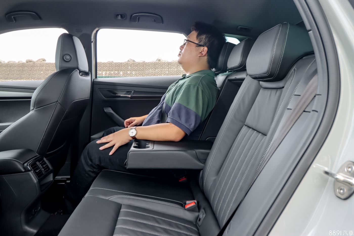 後排與前座有著相類似的座椅設計,坐墊長度足、前緣支撐佳,165cm的我入座後,頭部空間充足,膝部尚可,壓迫感不會太明顯,雖然椅背設計沒前座立體卻依然服貼,唯椅背角度稍嫌直挺些。