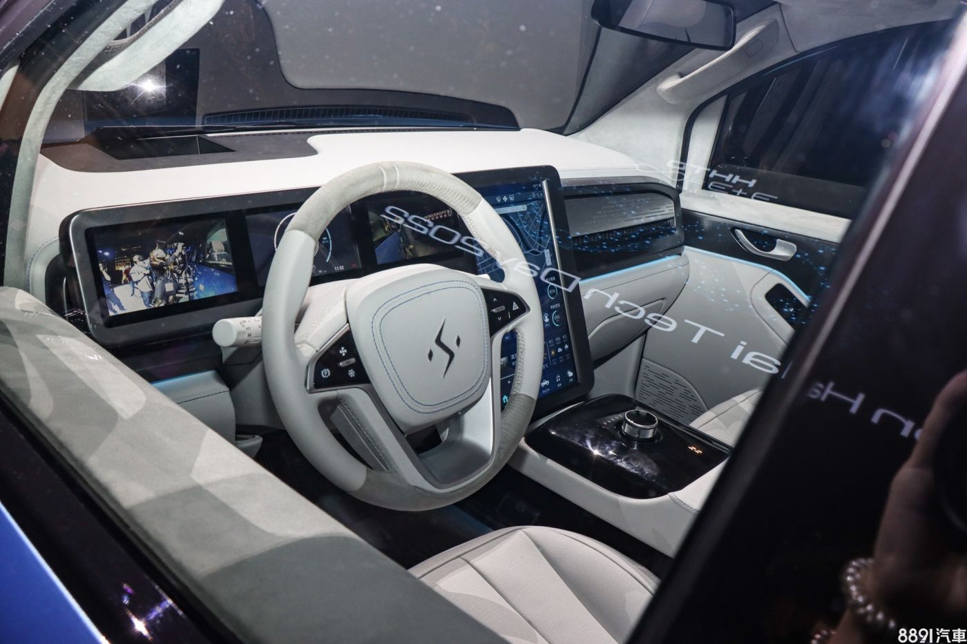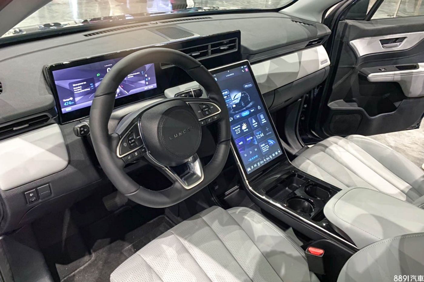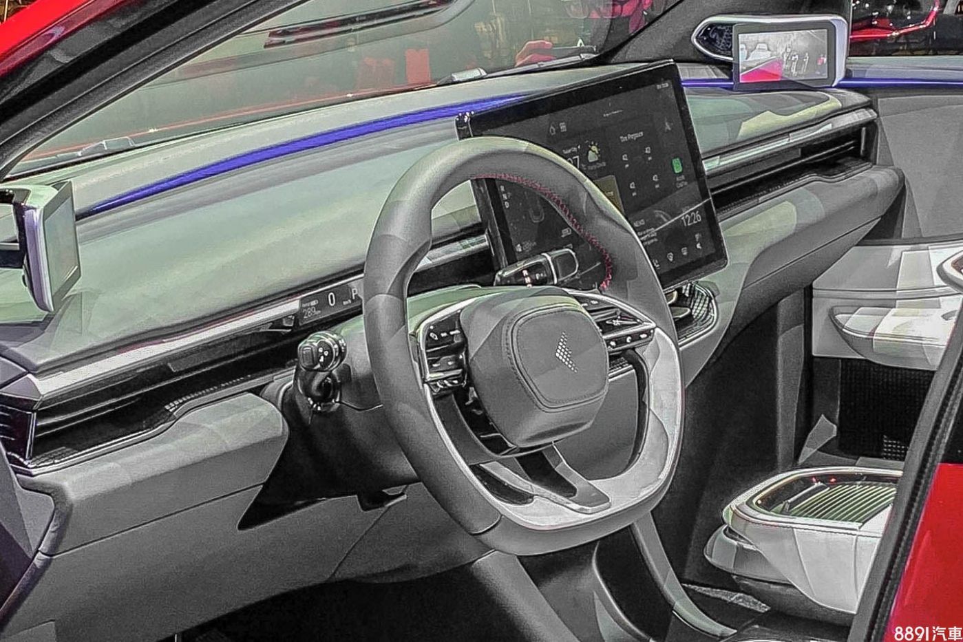座艙則採雙螢幕設計,採儀錶資訊以小螢幕內嵌於儀表台,中控台則搭配15.6吋中控螢幕,儀錶台兩側則為數位後視鏡畫面。展示款並採白內裝搭配紅色安全帶做鮮明對比。官方表示Model B搭載駕駛輔助系統,但並未詳述包含哪些功能。