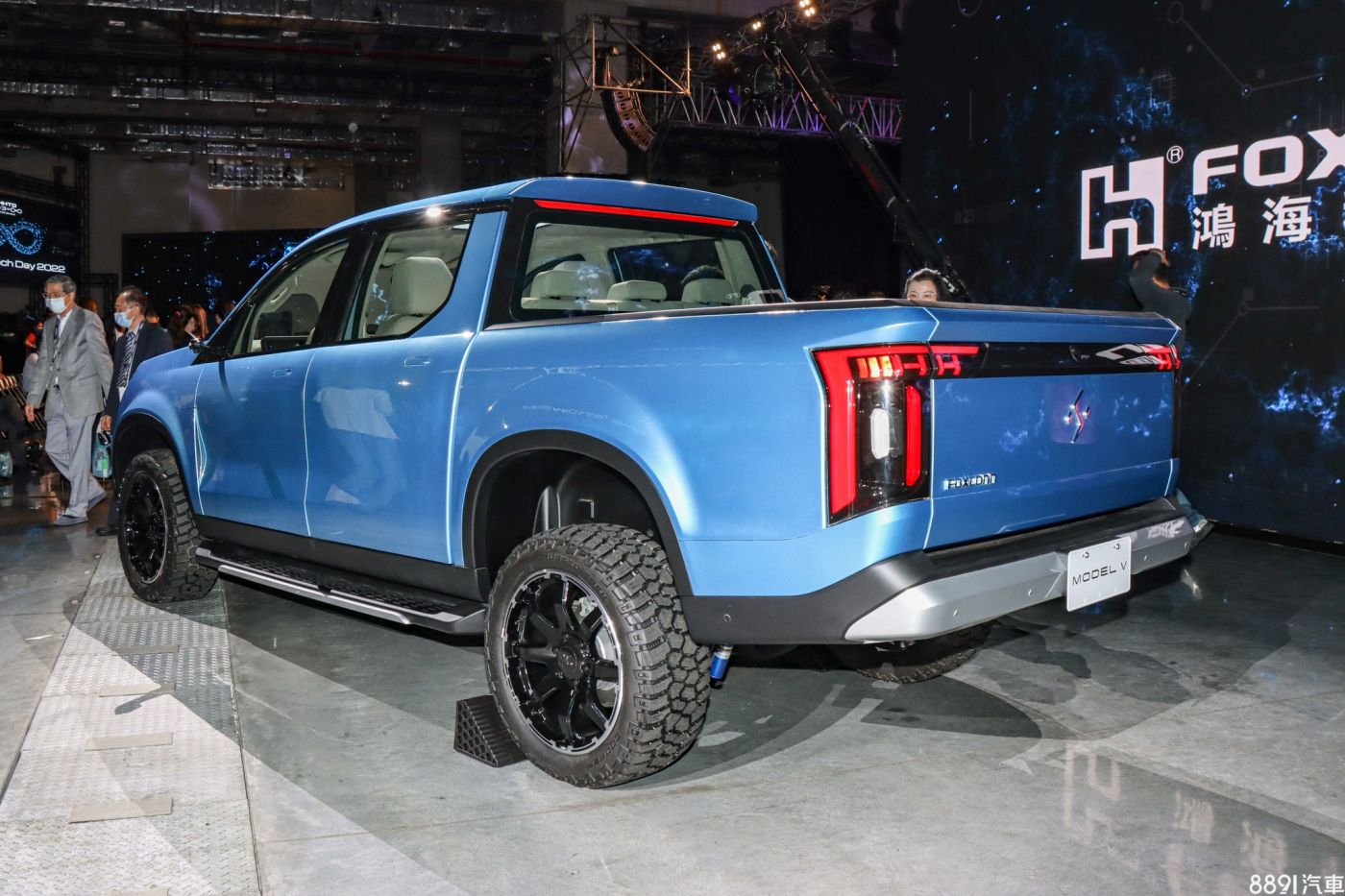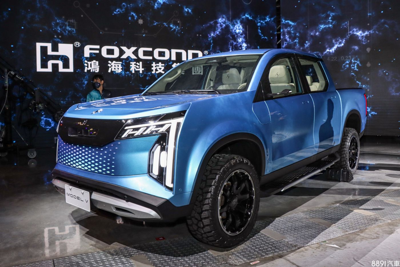 取名自「Victory勝利」的Model V,則是一款由鴻海自主開發的雙廂貨卡概念車,主要瞄準東南亞市場。燈組設計融入象徵鴻海的「HH」造型,車頭護板內嵌多色LED燈,用來顯示充電進度,傳統引擎室位置則規劃為置物空間。