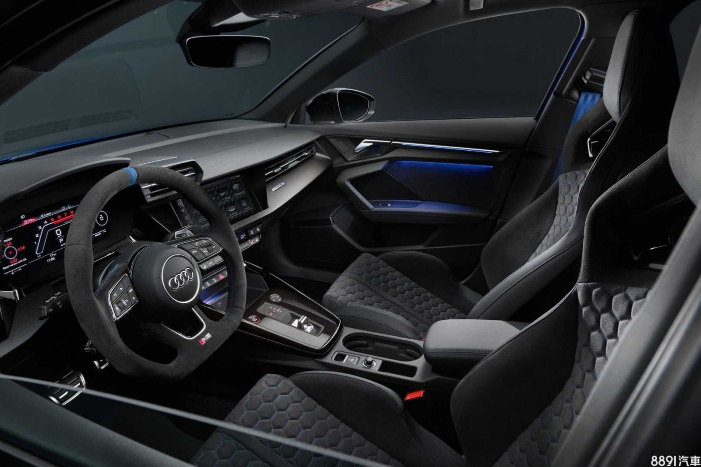 本次更是首度將賽車桶型座椅搭載到RS 3車系上,內裝以Dinamica超細纖維與Nappa皮革作為主要鋪陳,搭配多處碳纖維飾板與藍色元素妝點,副駕駛座前方更具有專屬「限量生產代號」銘牌。