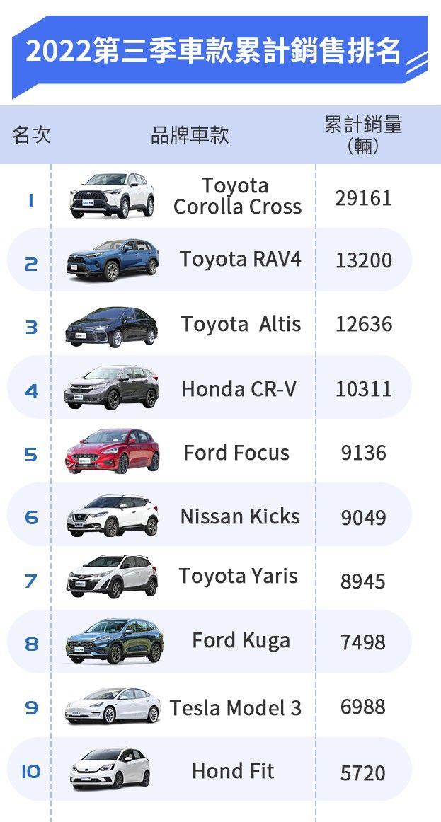 統計至2022年第三季為止,Corolla Cross依舊穩坐冠軍,今年平均每月約3240台的成績,與去年同期比起來說實話相去不遠,在堪稱艱困的大環境下,更顯實力堅強,2022年「神車」與「休旅王」雙冠王應該還是它持續蟬聯。