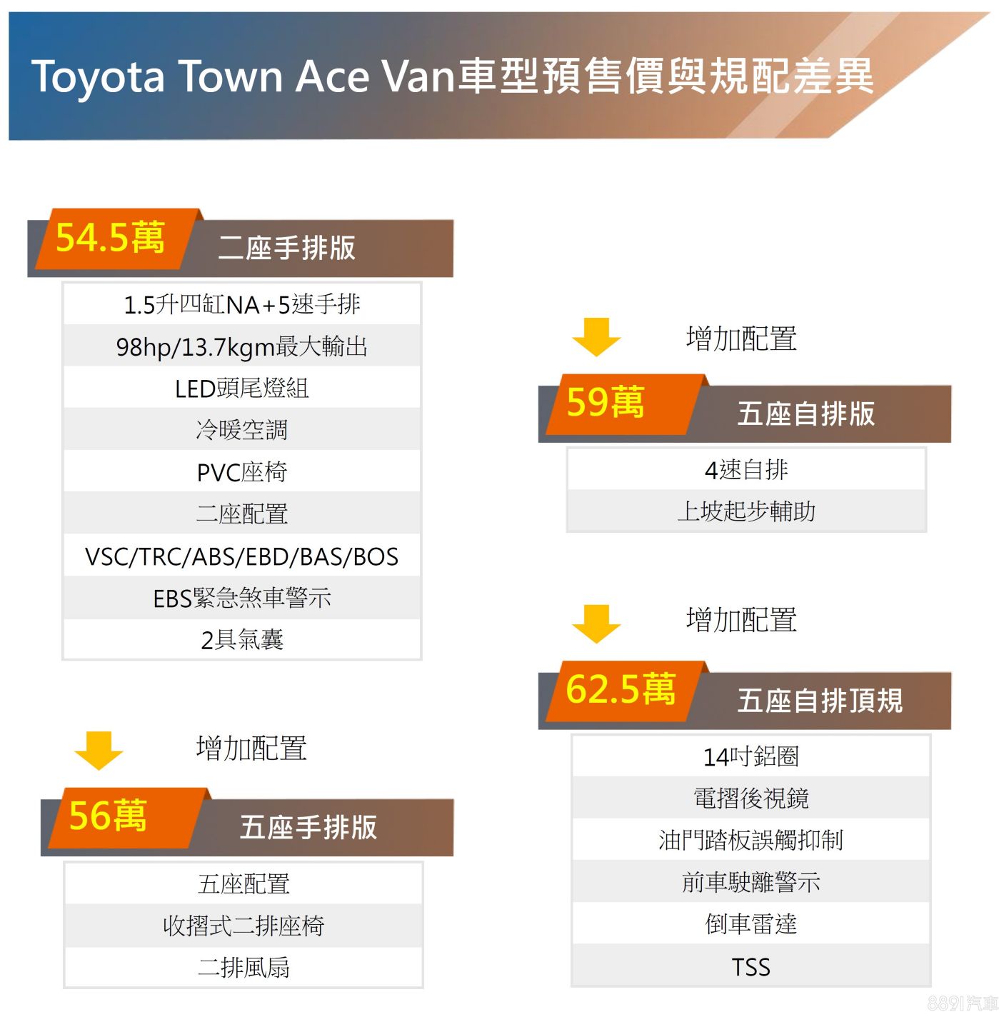 和泰今(10/26)正式公布Town Ace廂車版預售價格,提供2人座手排、5人座手排、5人座自排與5人座自排TSS四種車型,預售價分別為54.5萬、56萬、59萬、62.5萬,車色則提供雪貂白、極光銀兩種選擇。