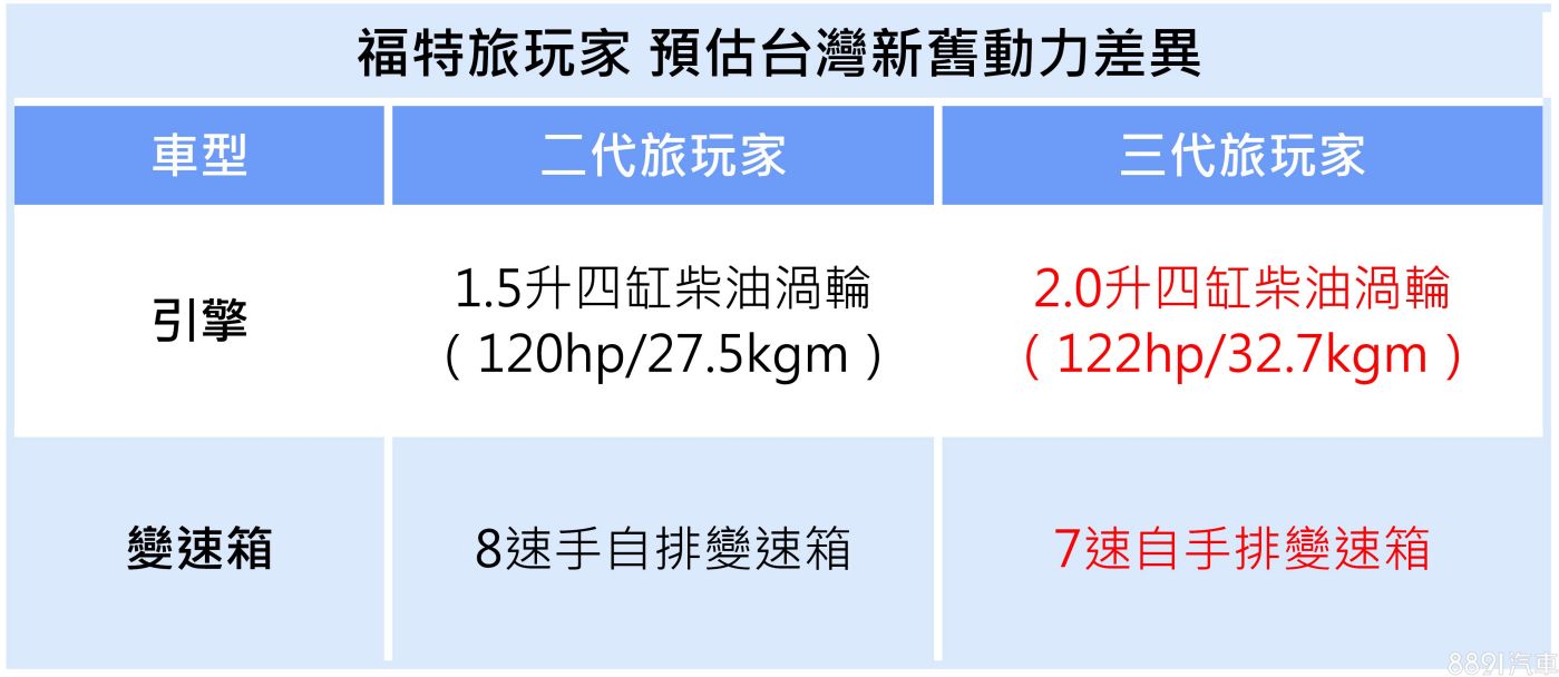 大改款旅玩家在海外共推出1.5升EcoBoost汽油渦輪引擎,及2.0升EcoBlue柴油渦輪引擎兩種動力,國內從舊款時便僅引進柴油動力,加上近期環保署送測資訊顯示,新款旅玩家改搭2.0升柴油引擎的可能性很高,對比舊款1.5升在馬力與扭力的表現都有所提升,變速箱則從原先的8速手自排,換成7速雙離合器自手排。