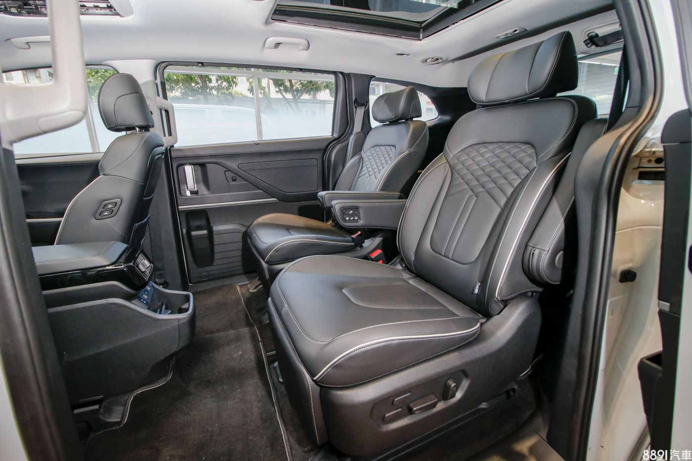 三排座採2+2+3配置,頂規車型二排配置「皇家座椅」,除了有「速洗」的兩側扶手、蝴蝶頭枕外,並具備電調仰躺/加熱通風/腿靠功能。