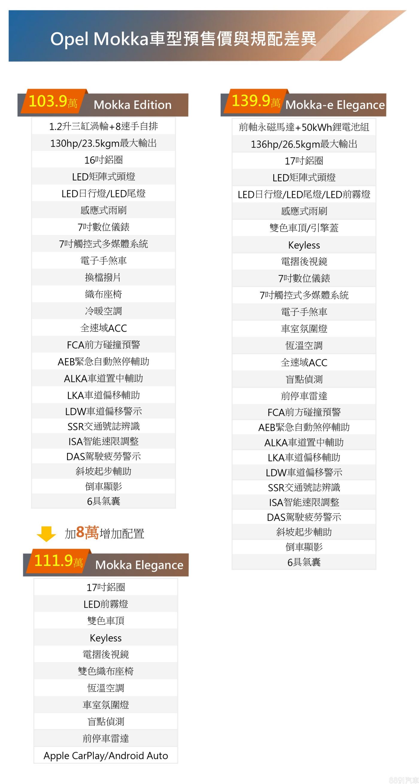 Opel Mokka將在台提供1.2升三缸渦輪汽油、純電兩動力,採Mokka Edition、Mokka Elegance、Mokka-e Elegance三車型編成,預售價分別為103.9、111.9、139.9萬元,正式發表預計會在12月中旬以後,最快可望今年底前開始交車,此外,目前想預定的消費者,可至官網留下資訊,或至全台巡迴展出現場洽詢,重點規配如附表。