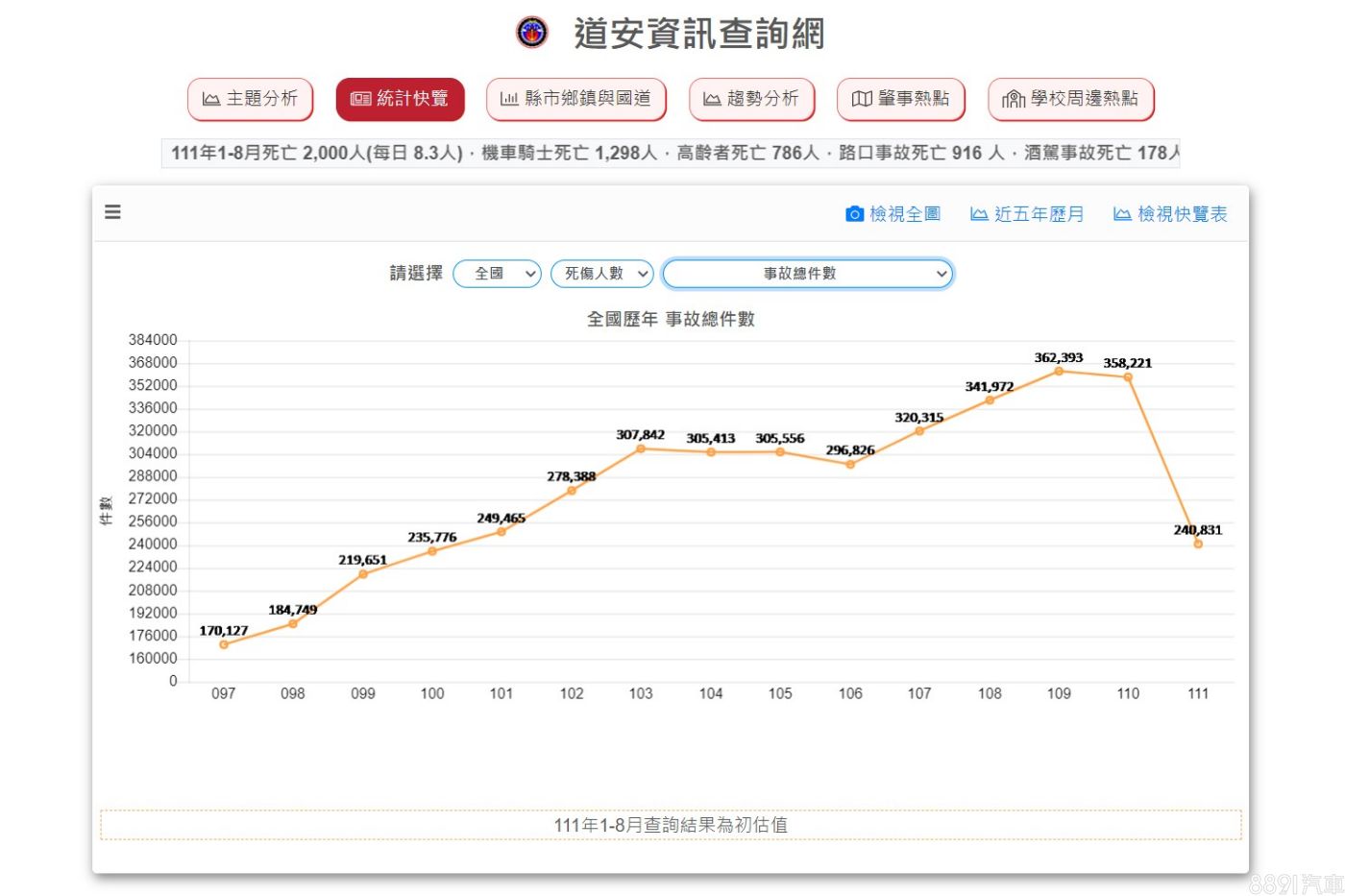 根據交通部道安會統計,光去年全年涉及人員死傷的交通事故件數就高達35.8萬件,在過去15年來僅次於2020年的高峰,造成的死傷人數將近48萬人,當中因追撞事故所致者更超過6.1萬人,佔同年車禍總死傷人數約12.8%的比例。(圖/道安資訊查詢網)