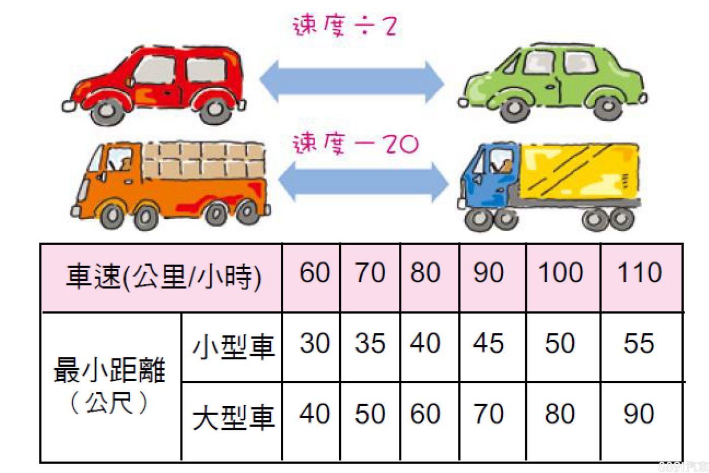 何謂安全距離?根據高速公路及快速公路交通管制規則第6條,正常天候下小型車應以「車速數值÷2(公尺)」作為安全距離,大型車則為「車速數值-20(公尺)」,並應視天氣狀況酌情增加。(圖/公路總局官網)
