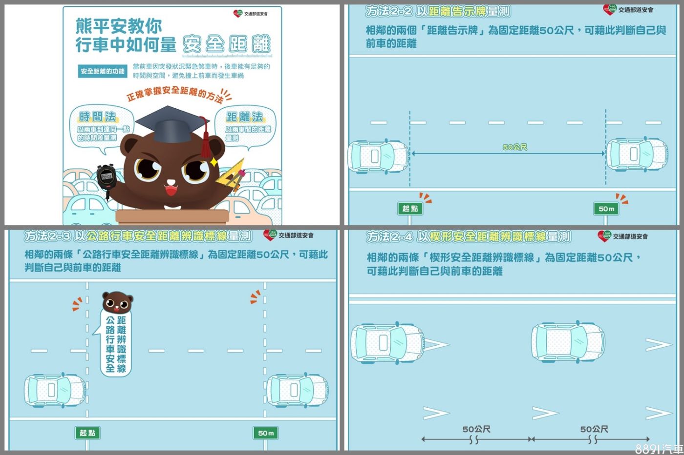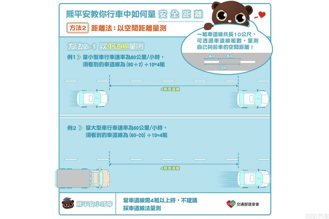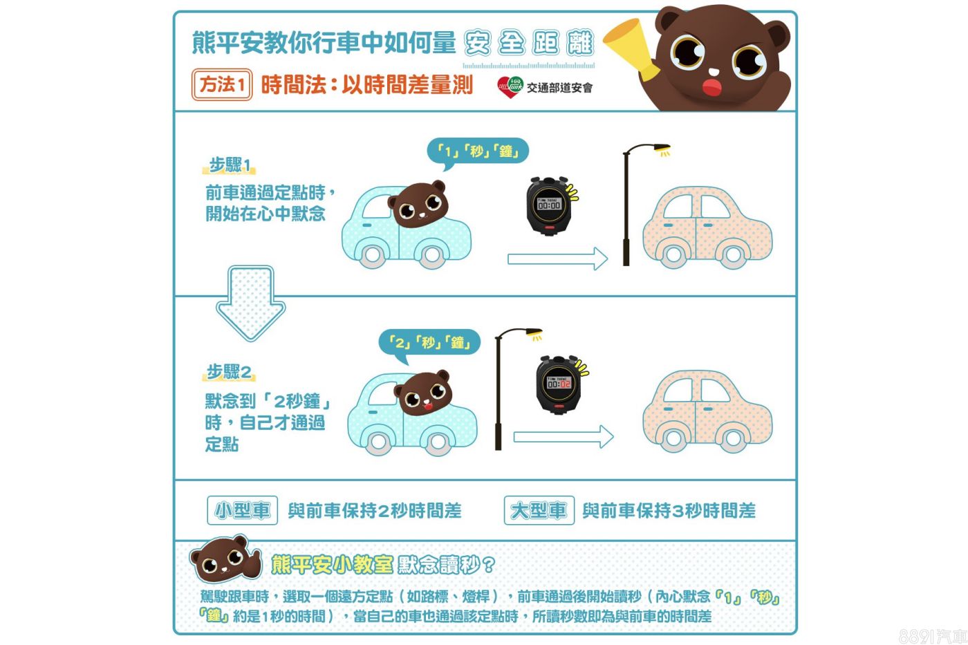 但即便知道安全車距,現實中該如何估算安全距離?交通部提出幾種建議方式,其一是以時間來估測,並建議小型車隨前車通過同一定點時,應保持至少2秒時間差,大型車則為3秒,駕駛亦應視天候及路況酌情適當拉長車距。(圖/交通部道安會)