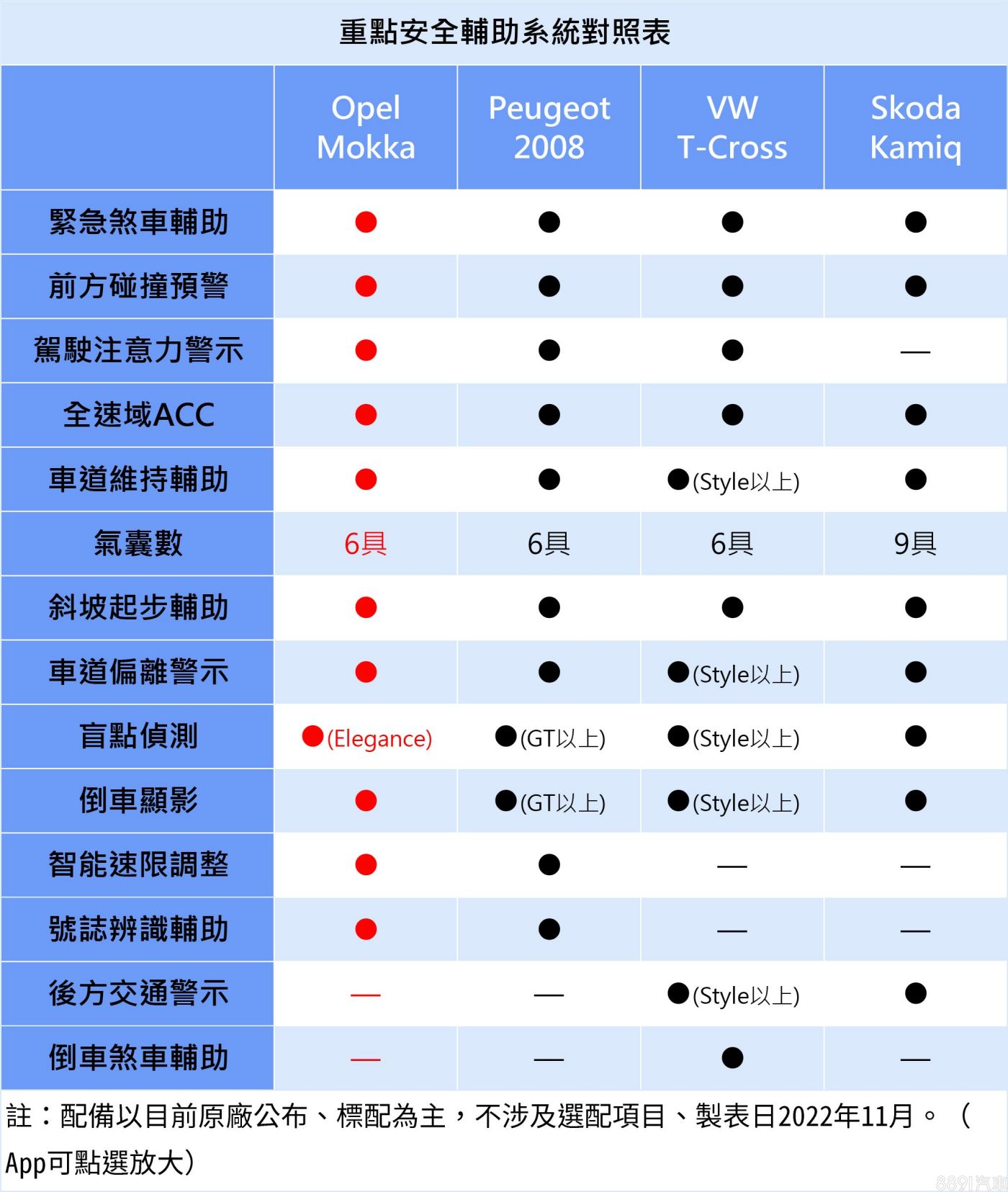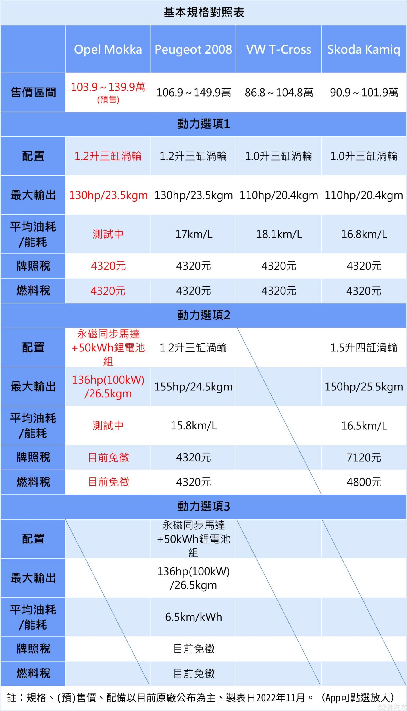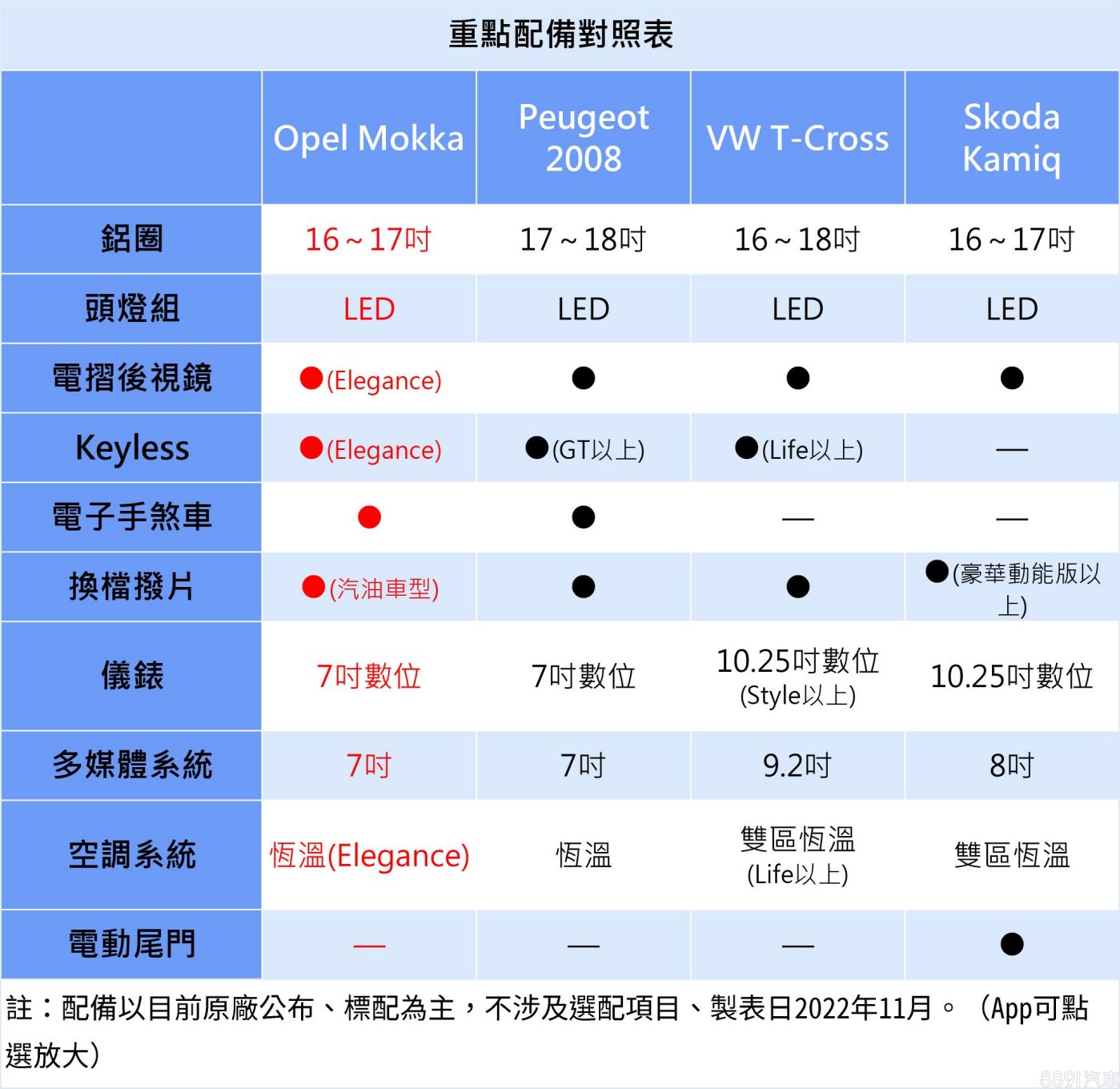 此外,就目前公布的Mokka預售價來看,雖說與「兄弟款」2008差異不大,但畢竟Peugeot在台受眾偏小,對比較為主流的VW T-Cross、Skoda Kamiq,明顯汽油動力在價格上較為弱勢,此時配備設定更顯重要!
