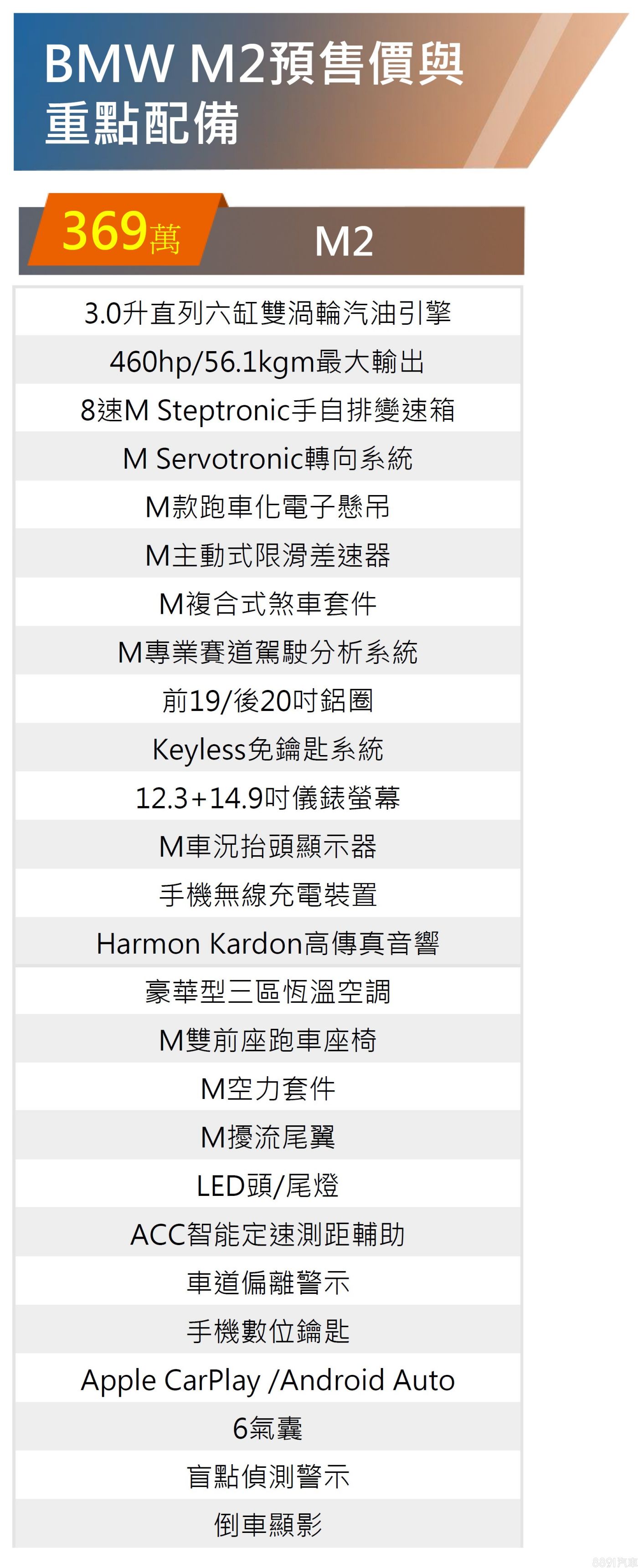 根據經銷端流出資訊,代號G87的新世代M2開出369萬的預售價,動力搭載現行M3/M4上、代號為S58的3.0升直列六缸雙渦輪汽油引擎,最大輸出460hp/56.1kgm,若相比前代基本款,最大馬力漲幅達90hp,入手門檻卻少了16萬!